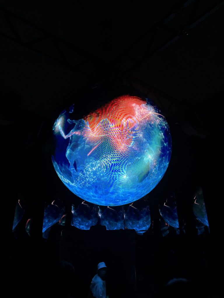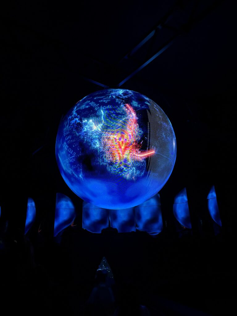 They proceed under a 2.5 m spherical LED globe which animates Singapore’s trade routes —mirrored reflectors below amplify immersion. The spiral ramp descends chronologically backwards through time, with projections guiding the visitor through the historical eras.