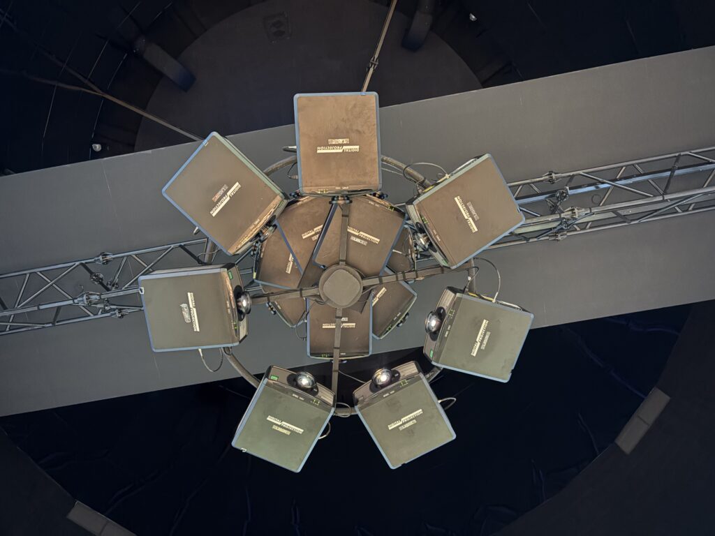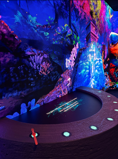 The path leads into a 360° “drum” arena where projections wrap around the space and an LED floor reacts to visitors’ movement. At various waypoints, interactive stations respond to the wristband, triggering animations, lighting cues, or hidden content.